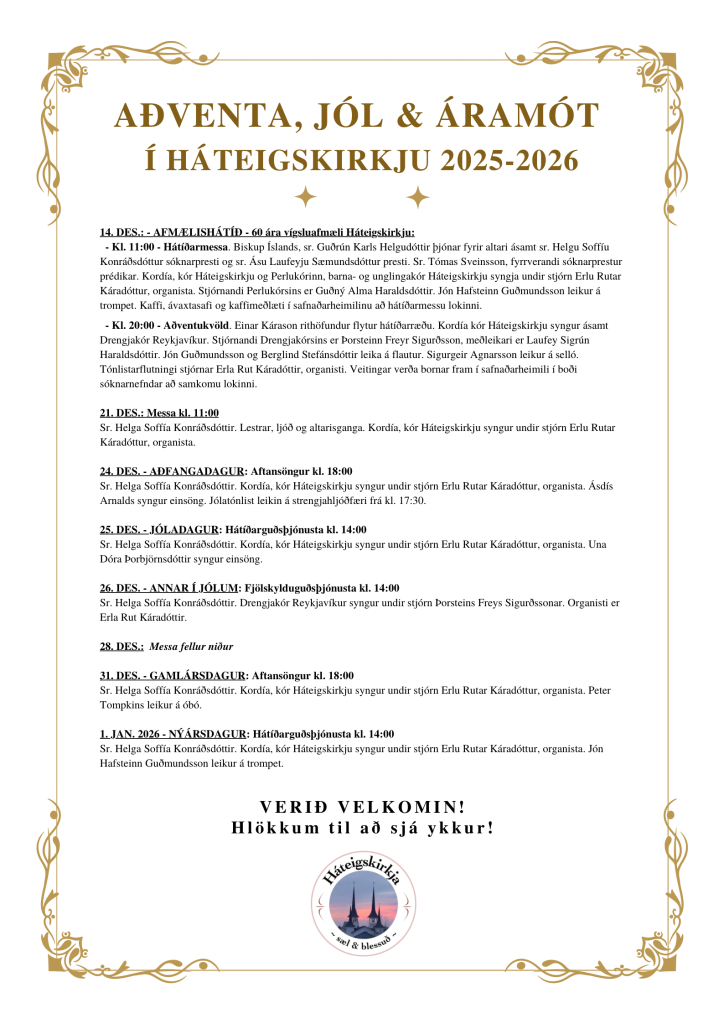 – Kl. 11:00 – HÁTÍÐARMESSA. Biskup Íslands, sr. Guðrún Karls Helgudóttir þjónar fyrir altari ásamt sr. Helgu Soffíu Konráðsdóttur sóknarpresti og sr. Ásu Laufeyju Sæmundsdóttur presti. Sr. Tómas Sveinsson, fyrrverandi sóknarprestur prédikar. Kordía, kór Háteigskirkju og Perlukórinn, barna- og unglingakór Háteigskirkju syngja undir stjórn Erlu Rutar Káradóttur, organista. Stjórnandi Perlukórsins er Guðný Alma Haraldsdóttir. Jón Hafsteinn Guðmundsson leikur á trompet. Kaffi, ávaxtasafi og kaffimeðlæti í safnaðarheimilinu að hátíðarmessu lokinni.