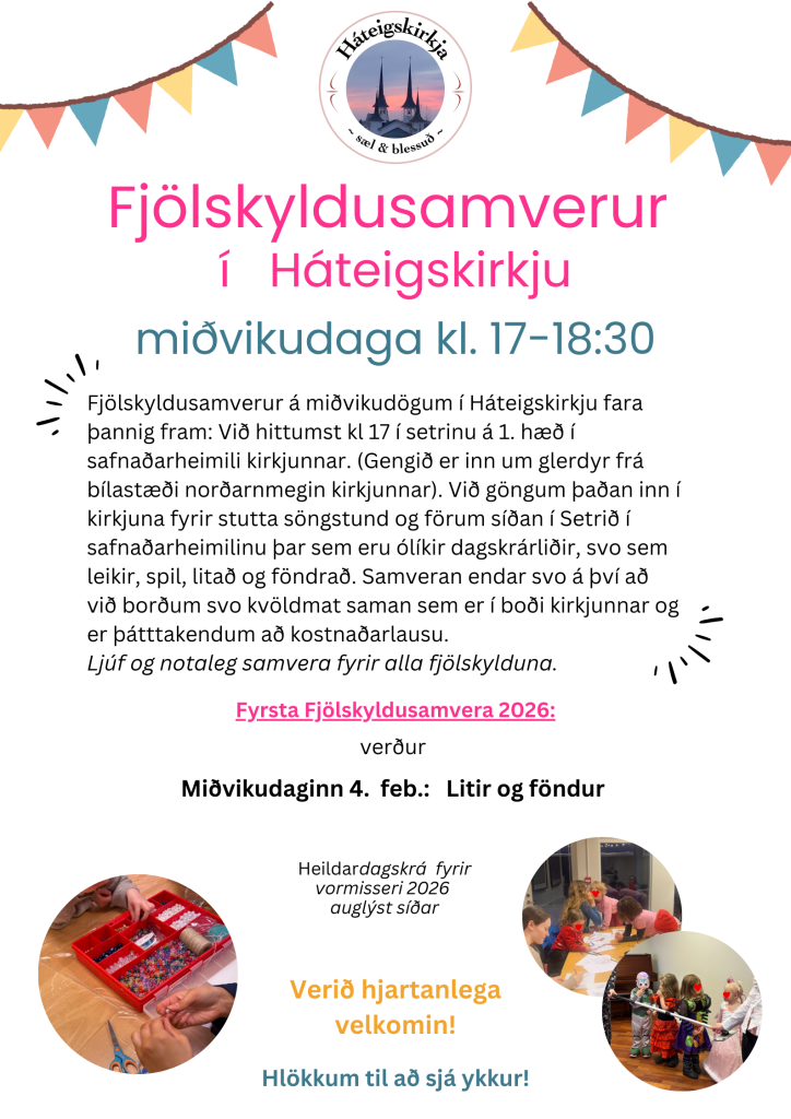 Fyrsta FJÖLSKYLDUSAMVERA á vormisseri 2026 verður á morgun MIÐVIKUDAG 4. febrúar kl. 17-18:30 í safnaðarheimili Háteigskirkju. Umsjón hefur Matthías Guðmundsson guðfræðinemi. Sjá nánari upplýsingar á meðfylgjandi auglýsingu. Verið öll hjartanlega velkomin!