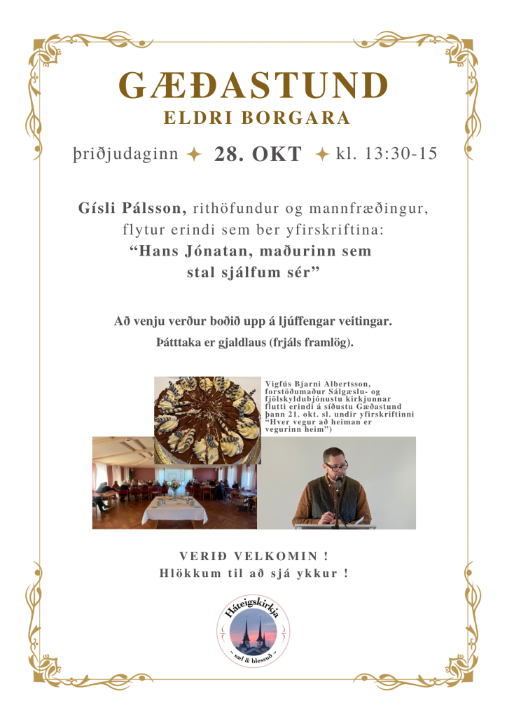 Næsta GÆÐASTUND eldri borgara verður næstkomandi þriðjudag 28. okt. kl. 13:30 til 15 í veislusal á 2. hæð í safnaðarheimili Háteigskirkju. Gísli Pálsson, rithöfundur og mannfræðingur, flytur erindi sem ber yfirskriftina “Hans Jónatan: