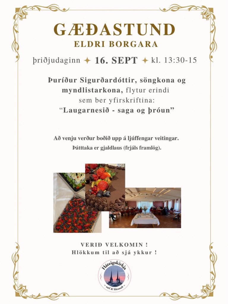 Fyrsta GÆÐASTUND eldri borgara á haustmisseri 2025 verður næstkomandi þriðjudag 16. sept. kl. 13:30 til 15 í veislusal á 2. hæð í safnaðarheimili Háteigskirkju. Þuríður Sigurðardóttir, söngkona og myndlistarkona flytur erindi sem ber yfirskriftina “Laugarnesið – saga og þróun”. Að venju verður boðið upp á góðar veitingar. Þátttaka er gjaldlaus (frjáls framlög). Verið hjartanlega velkomin! Hlökkum til að sjá ykkur!