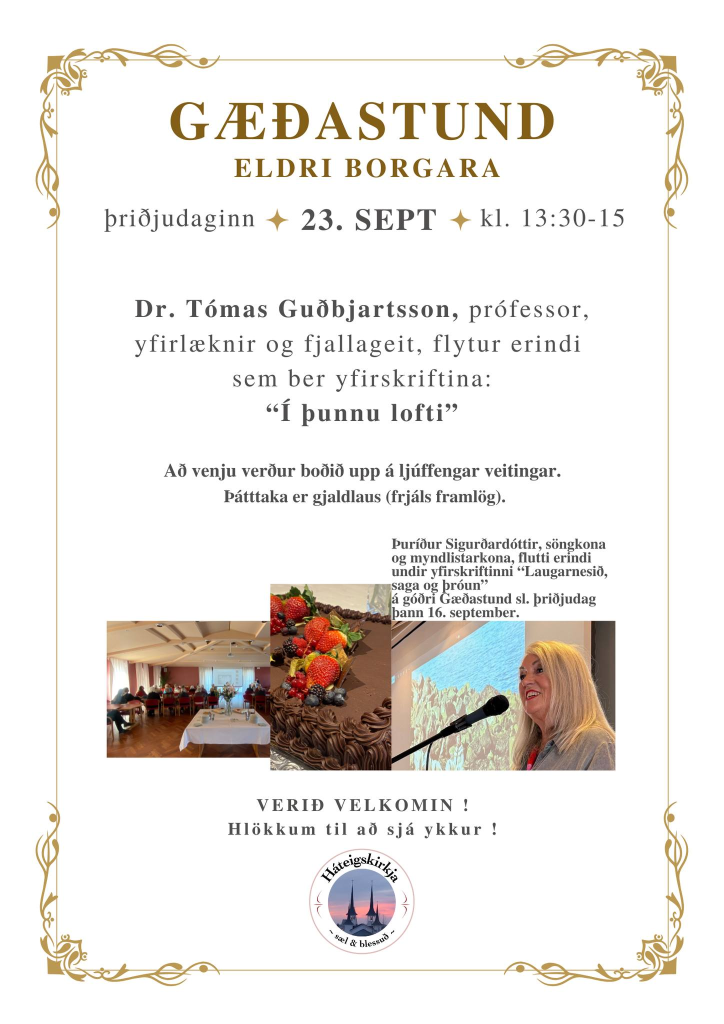 Næsta GÆÐASTUND eldri borgara á haustmisseri 2025, verður næstkomandi þriðjudag 23. sept. kl. 13:30 til 15 í veislusal á 2. hæð í safnaðarheimili Háteigskirkju. Dr. Tómas Guðbjartsson, prófessor, yfirlæknir og fjallageit, flytur erindi sem ber yfirskriftina „Í þunnu lofti“. Að venju verður boðið upp á góðar veitingar. Þátttaka er gjaldlaus (frjáls framlög). Verið hjartanlega velkomin! Hlökkum til að sjá ykkur!