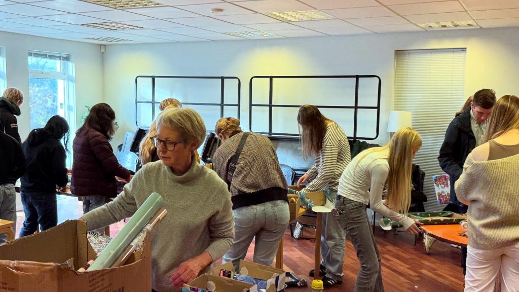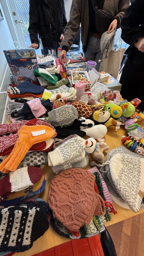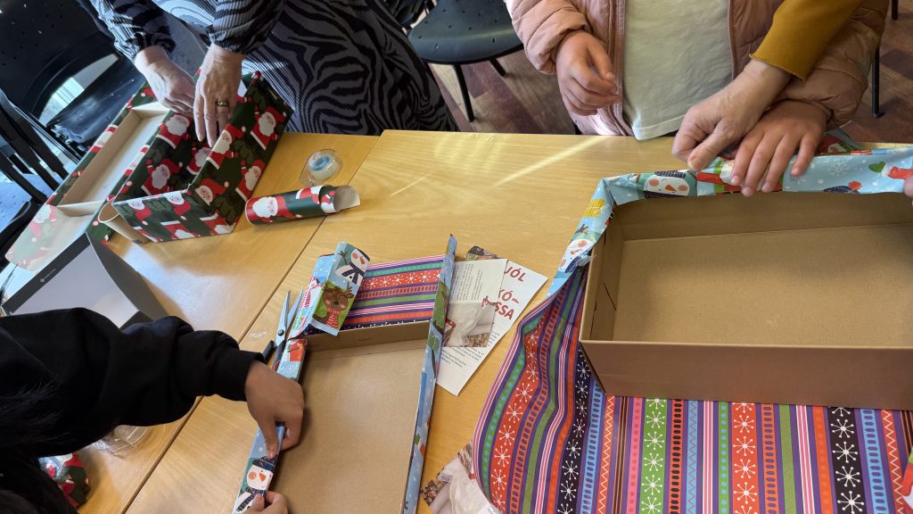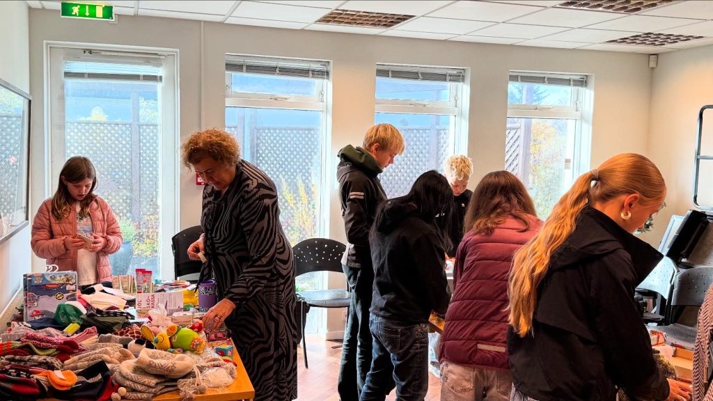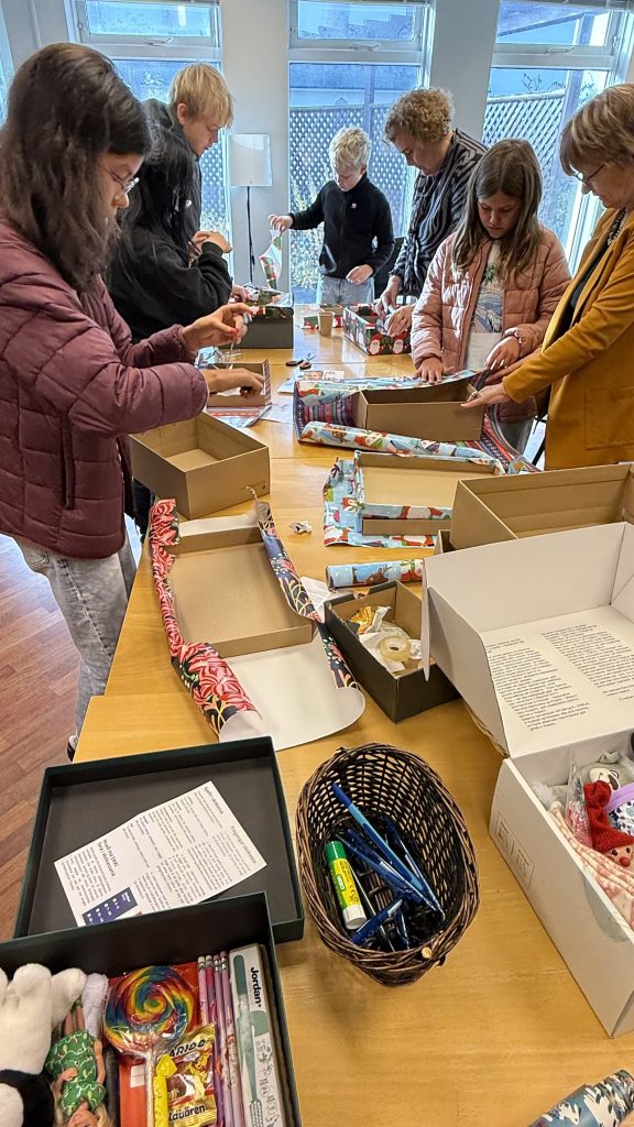 Fjöldi áhugasamra þátttakenda lögðu sitt af mörkum í Háteigskirkju í gær, sunnudag 19. okt., fyrir verkefnið JÓL Í SKÓKASSA sem KFUM og KFUK standa fyrir og gengur út á að útbúa jólagjafir handa munaðarlausum börnum í Úkraínu. Unnið var að verkefninu í Setrinu, kaffistofu á jarðhæð safnaðarheimilis Háteigskirkju, að lokinni fjölskylduguðsþjónustu. Um var að ræða fallega og gefandi samverustund en útkoman var fjöldi góðra, fallegra og nytsamlegra jólagjafa fyrir börn á öllum aldursbilum. Allar gjafirnar innihalda amk einn hlut úr hverjum af eftirfarandi fimm flokkum: LEIKFÖNG, SKÓLADÓT, HREINLÆTISVÖRUR, SÆLGÆTI og FÖT. Háteigskirkja lagði margt til, hugljúfar ömmur sendu hlýjar heimaprjónaðar flíkur og þátttakendur komu einnig færandi hendi.