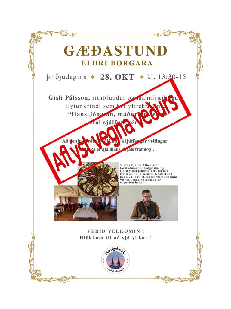 VINSAMLEGAST ATHUGIÐ – ÁÐUR AUGLÝSTRI GÆÐASTUND ELDRI BORGARA í dag, þriðjudag 28. okt., er AFLÝST VEGNA VEÐURS ! Posted on 28/10/2025 by Rakel Halldórsdóttir